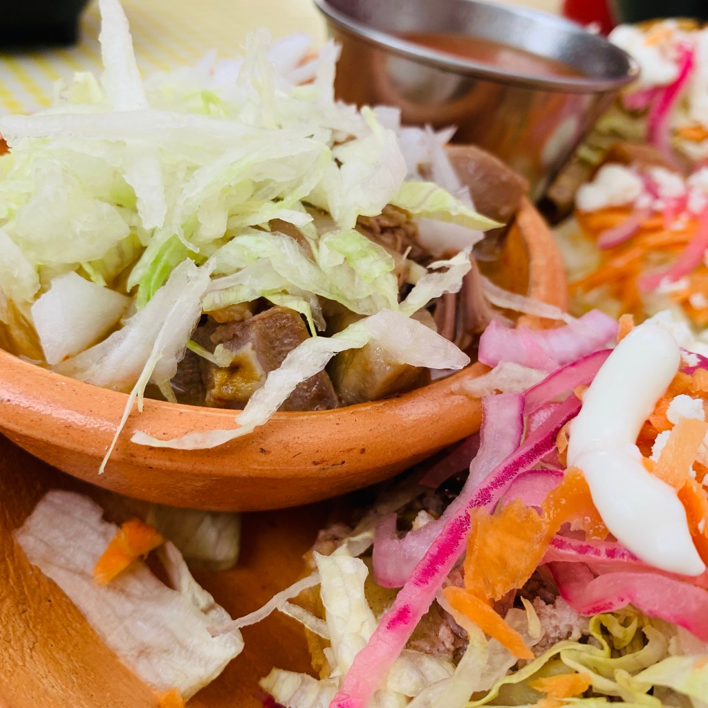Plato Mayora: dos gorditas de papa, un sope de picadillo, una enchilada de pollo, un taco dorado de pierna, acompañado de un mini pozole.