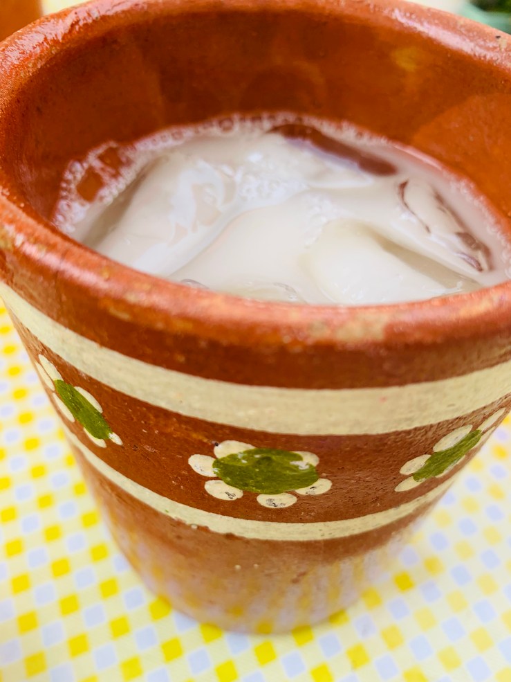 La bebida es la tradicional horchata de arroz, servida en jarro de barro, que le brinda su encanto. La salsa es la típica de chile cola de rata, que nombrada Mayora tiene su propia versión.