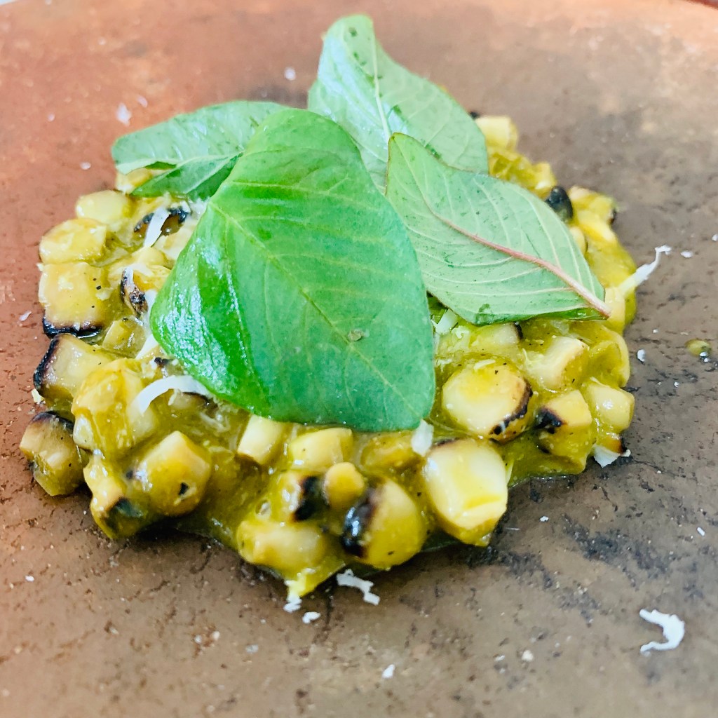 El segundo tiempo brinda el confort de una correcta sopa de frijoles salvajes con tortillas y al que le sigue un tamal de hongos con chile guajillo, crema, y acelgas, que destacaba por la textura de su masa aterciopelada. cuya masa tenía una textura aterciopelada.
