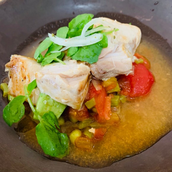 El cuarto tiempo fue un pescado del tipo dorado, cuya frescura aprecia quien conoce los sabores del mar, todavía jugos y en el que se percibia una nota sutil de la siempre deliciosa manteca de puerco. sobre un caldillo de camarón, con habas, nopales, chícharos, jitomate, berros y cebolla encurtida. Esta fiesta de saborescon la predominancia suave del sabor del pescado.