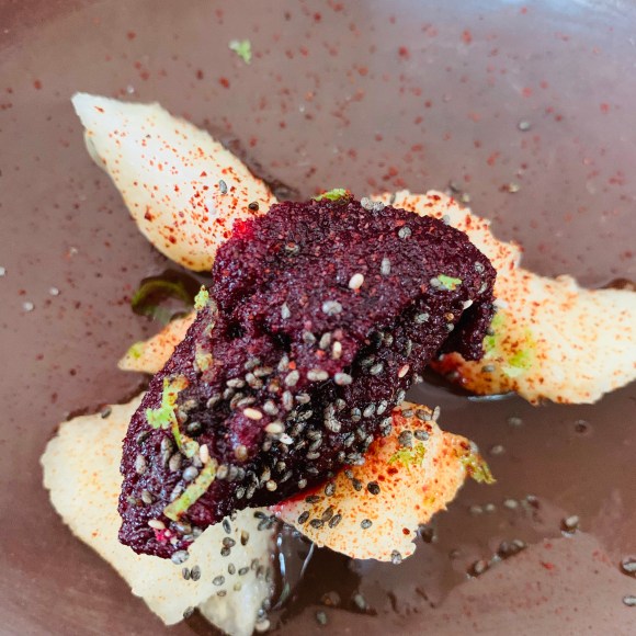 El prepostre cumple su función de limpiar el paladar con la frescura de jícama con mezcal y una especie de mermelada de chamoy con chía, que me remitía a una jicaleta enmezcalada y deconstruida.