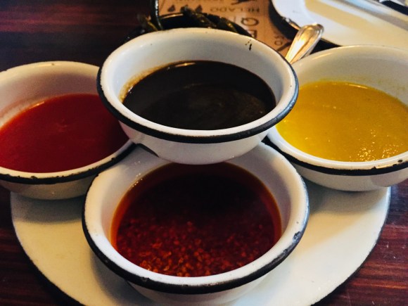 La carne que utilizan proviene de Sonora y la aderezan con sólo sal y pimienta, tomando el punto exacto en el asador. Los condimentos forman parte de la propuesta, pues llegan a la mesa en unos platitos de peltre conteniendo catsup de manzana, bbq de chicozapote, mostaza dijon, chiles toreados y salsa macha.