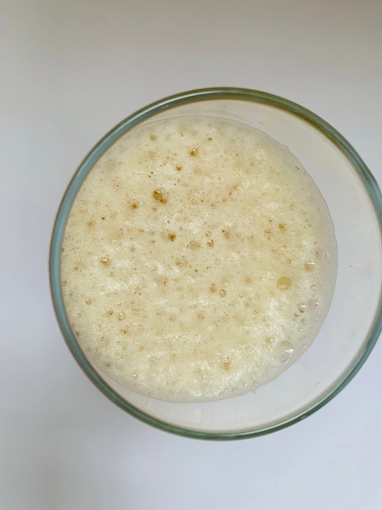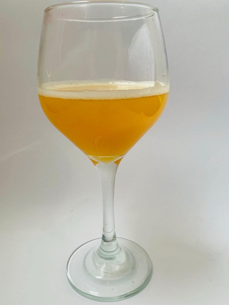 Al servirla se genera bastante espuma, que persiste en un nivel medio, de color amarillo pálido, apariencia cremosa y adherencia media baja. La efervescencia es poco notable, debido a la turbidez o en consecuencia.