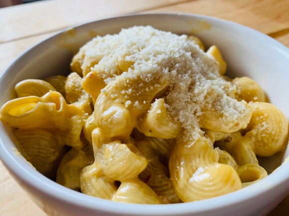 La entrada fue el clásico mac and cheese, que aquí se logra a punto respetando su origen casero con el uso generoso de cheddar y se realza terminándolo con una lluvia de parmesano.