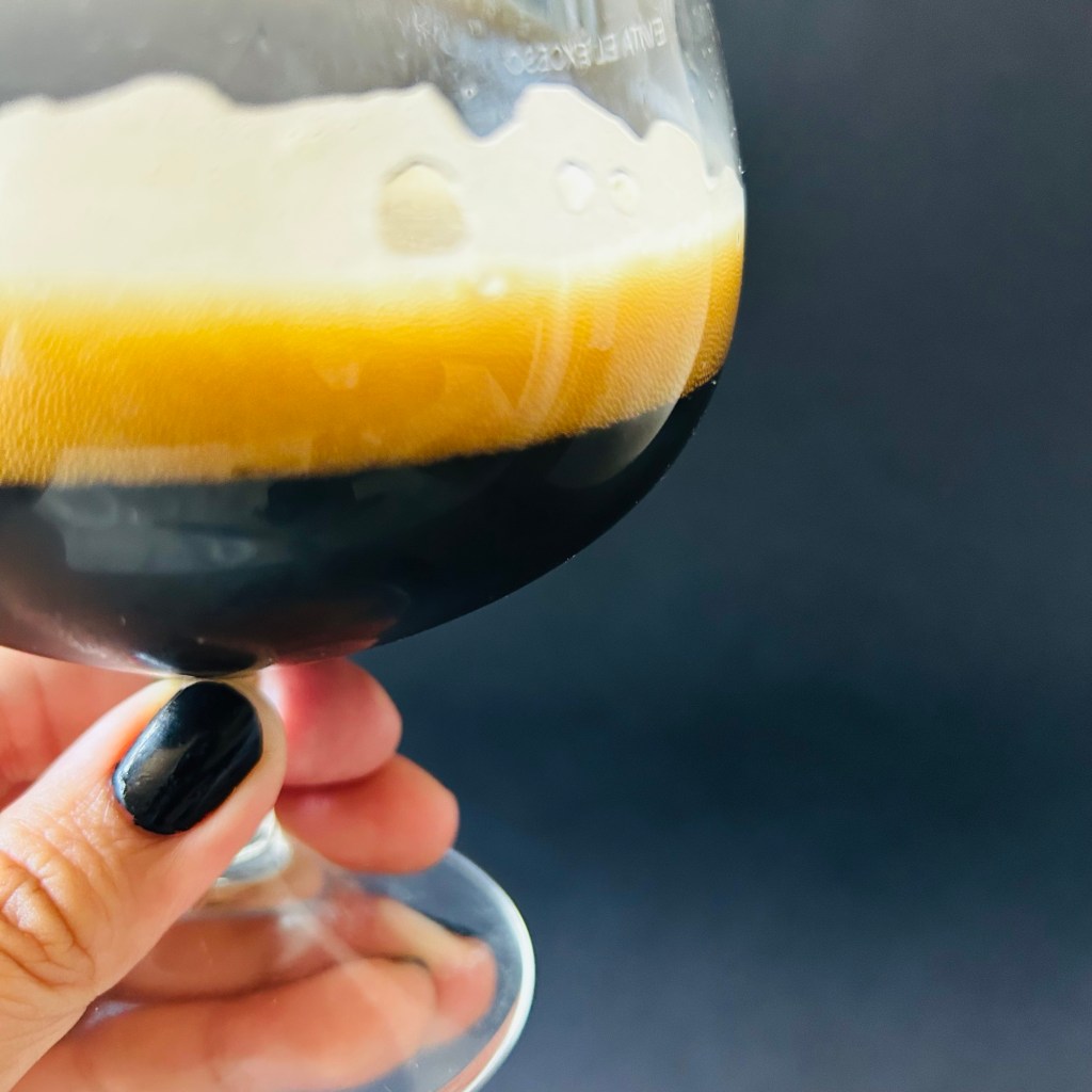 Es oscura en vista, velada y visiblemente densa, coronada por un giste medio bajo compacto, color capuchino de burbujas pequeñas y algunas medias.