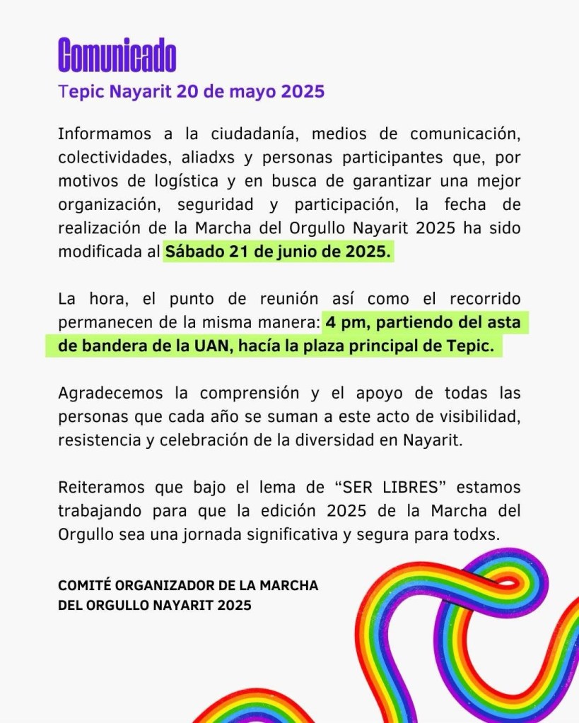 La Marcha la organiza el Comité Orgullo Nayarit, personas que se definen con un también hermoso «como tú» y que están encargadas de gestionar todos los trámites necesarios para que el evento se llevará a cabo el sábado 08 de junio a partir de las 4 p.m. .