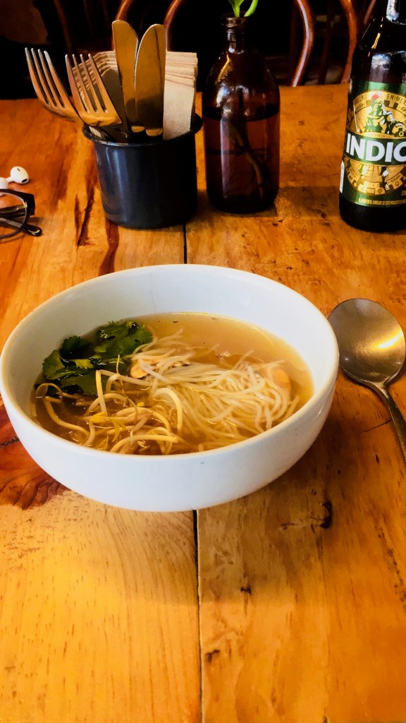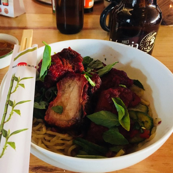 También tienen opciones cárnicas como estos deliciosos fideos con pork belly. Ofrecen también para beber cerveza bohemia.