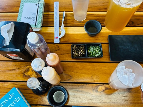 En la mesa colocan cebollino, jalapeño y también aderezos con los cuales personalizar a tu gusto la orden: catsup con siracha, salsa de anguila, mayonesa con chipotle y claro la clásica salsa de soya.