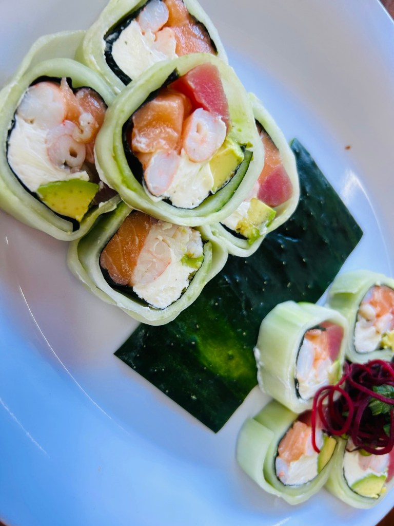 Salmón, atún, camarón, filadelfia y aguacate envueltos en pepino reciben el nombre de Keto Roll, un ingenioso Maki que al evitar el arroz cumple con esta restricción alimentaria ofreciendo el disfrute completo en toda la frescura de los ingredientes.