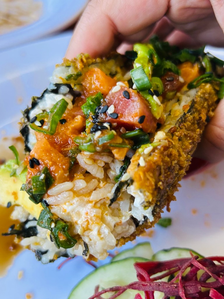 Se trata de una ingeniosa preparación de un maki completo que se abre para rellenar con Filadelfia y salmón spicy, y aderezar con aguacate, semillas de ajonjolí y salsa de anguila logrando un platillo vistoso, delicioso e instagrameable.