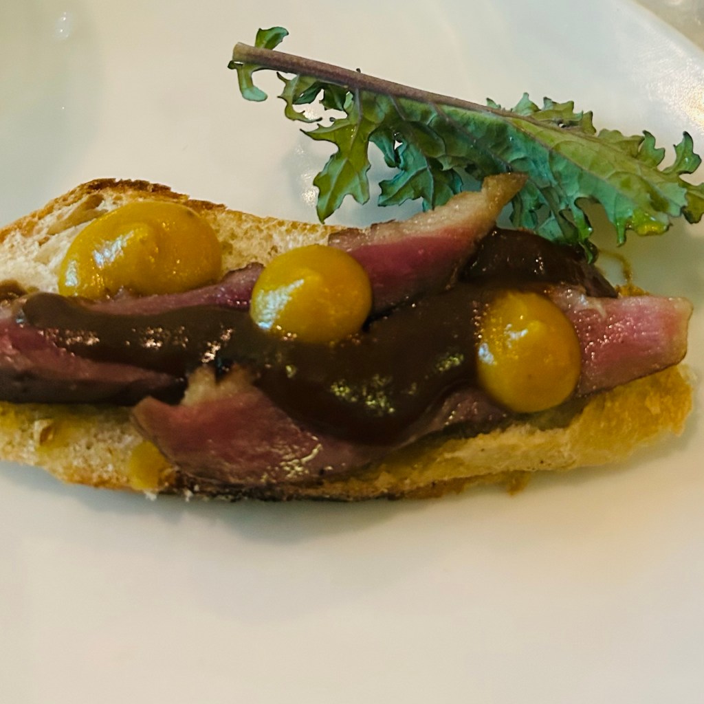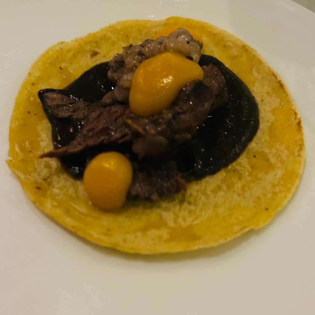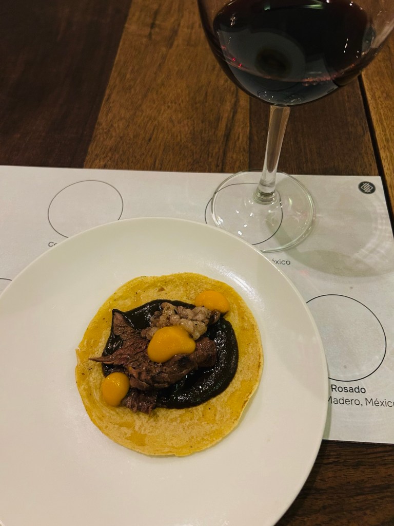 El maridaje fue un taco de Rib Eye con mole negro y puré de calabaza amarilla.