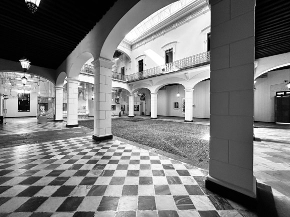 El piso, dispuesto casi como un tablero, guía nuestros pasos a través de salas que combinan arquitectura y arte. Los arcos enmarcan la luz, y los patios interiores se abren como respiraderos de calma en medio del bullicio urbano. Algunas paredes en blanco y negro acentúan la fuerza de las obras y permiten que los colores de ciertos detalles cobren protagonismo de manera inesperada.