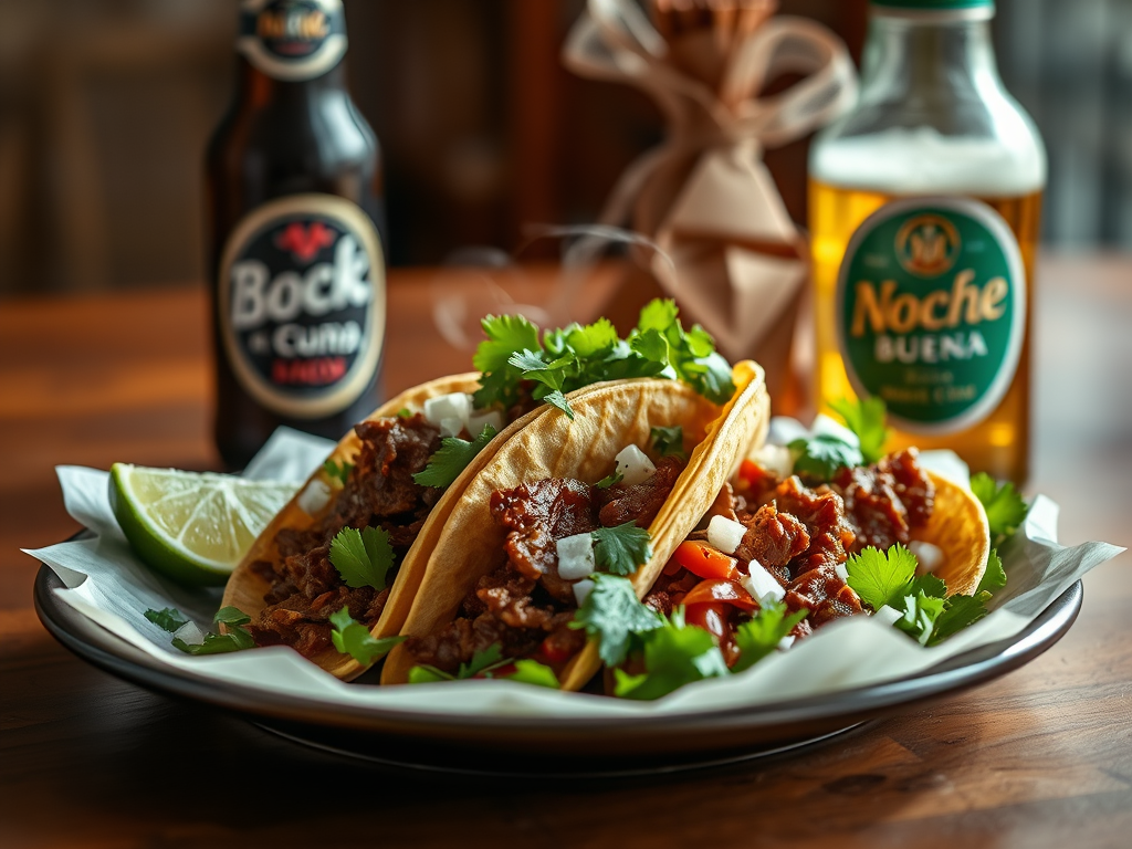 Hay cenas que saben a hogar, aunque la mesa sea pequeña y el antojo enorme. Esta es mi manera favorita de cerrar un día frío: tacos de asada hechos en casa, con su salsita bien fresca, la carne todavía chisporroteando… y una Noche Buena helada para acompañar.