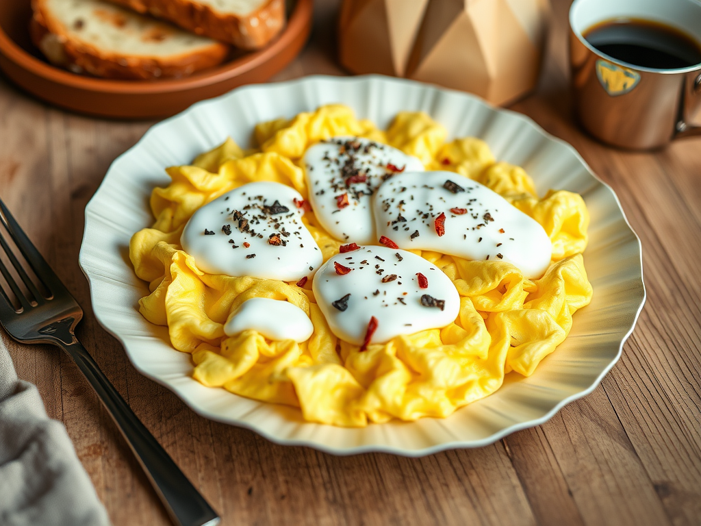 huevos suaves y calientes, mantequilla derritiéndose lento, tzatziki frío y cremoso encima, pimienta que perfuma y chile quebrado que muerde suave.