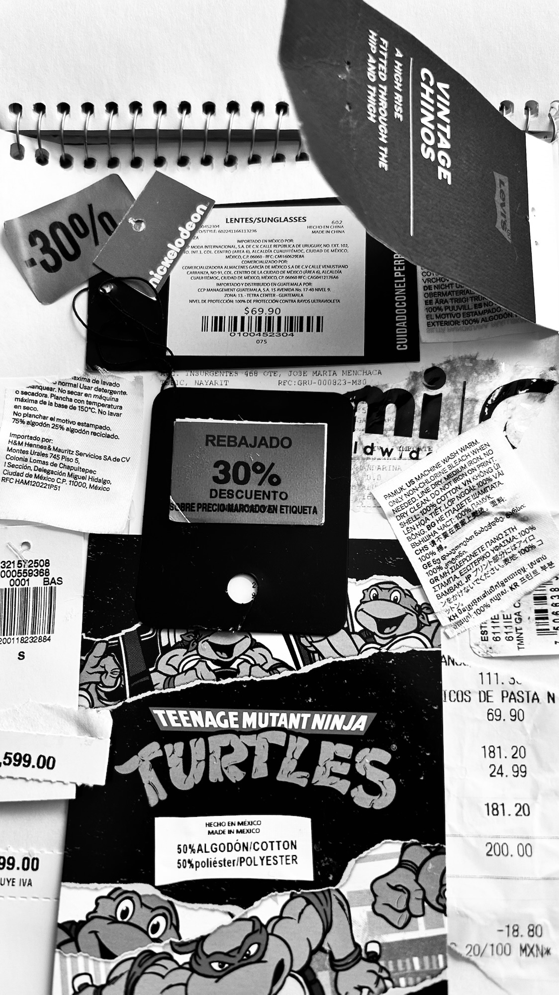 Collage con etiquetas de mi propia ropa. Las corté una por una. Las que rozaban la piel, las que decían cómo lavarme, las que recordaban de qué estoy hecha. Con ellas armé una superficie nueva, un cuerpo de nombres ajenos, una advertencia íntima: Save Yourself. Lo hice con la ropa que uso para que no […]